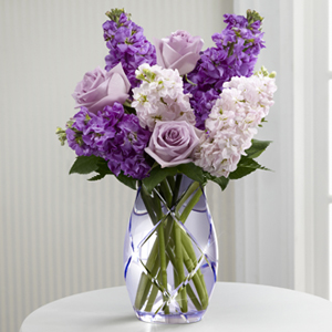 The FTD® Sweet Devotion™ Bouquet by Better Homes and Gardens® brings together roses and stock stems to design a wonderful wish for perfect happiness for your special recipient. Lavender roses and stock are accented with pink stock and lush greens to create an amazing flower bouquet. Lovingly arranged in a designer lavender etched glass vase, this flower arrangement offers them a beautiful expression of your sweetest sentiments to celebrate Mother’s Day, extend your happy birthday wishes or to help celebrate the arrival of spring.